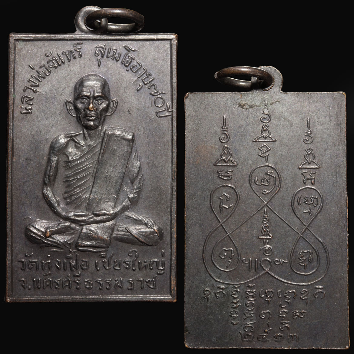 เหรียญหลวงพ่อจันทร์ วัดทุ่งเฟื้อ นครศรีธรรมราช รุ่นแรก ปี 2513 ทองแดงรมดำ หลวงพ่อจันทร์ พระเกจิอาจารย์ที่ทรงวิทยาอาคมสูง ปฏิบัติธรรมวิปัสสนากรรมฐานจนได้ญาณถึงขั้นสามารถรู้เหตุการณ์ล่วงหน้า รวมกระทั่งสามารถเรียกและตัดเหล็กไหลได้ ตามประวัติ หลวงปู่จันทร์ สุเมโธ เกิดเมื่อวันที่ ๑๘ พฤษภาคม ๒๔๕๓ ณ บ้านหลาแก้ว อำเภอหัวไทร จังหวัดนครศรีธรรมราช ตอนเยาว์วัยได้ศึกษาในสำนักของพระครูสังฆรักษ์วัดหลาแก้ว ได้ศึกษาอักขระและวิชาอาคม เมื่อเข้าสู่วัยรุ่นได้ศึกษาพุทธเวทจากสำนักต่างๆ พระอาจารย์ของท่านล้วนแต่สุดยอดวิชา เช่น หลวงพ่อท่านซัง วัดวัวหลุง หลวงพ่อท่านเอียด(ดำ)วัดในเขียว หลวงพ่อท่านเอียด(ขำ)วัดทรงบน หลวงพ่อท่านทอง วัดดอนสะท้อน เป็นต้น  หลวงพ่อท่านมีความมั่นใจในมหาอุตม์ที่ได้ปลุกเสกในเหรียญรุ่นแรก ถึงกับกล่าวว่า "หากยิงออก ไม่ต้องเอาไป" และเป็นจริงอย่างหลวงพ่อว่า ทำให้เหรียญรุ่นแรกเป็นที่เสาะหาเหล่าบรรดาลูกศิษย์ ราคาสมัยนั้นแพงกว่าเหรียญหลวงปู่เขียว วัดทรงบน เสียอีก ท่านไม่ได้สร้างเหรียญได้ขลังเพียงอย่าง ท่านยังสร้างเครื่องรางของขลังไดัขลังอีกด้วย โดยเฉพาะ "ควายธนู" มีฤทธิ์เดชเป็นอันดับหนึ่งของภาคใต้ หลวงปู่จันทร์ มรภาพเมื่อวันที่ ๑๐ พฤศจิกายน ๒๕๓๒ ในท่านั่งสมาธิ เป็นที่เลื่องลือไปทั่ว ในความมหัศจรรย์ ต่อมาปรากฏว่า สรีระของท่านไม่เน่าเปื่อย เหรียญที่แฟนตรีมูรติได้ชมเป็นเหรียญรุ่นแรกจำนวนการสร้างไม่มาก ปัจจุบันจะหาเหรียญสวยยาก และเหรียญปลอมมีหลายฝีมือ ดังนั้นโปรดระวังให้ดี เหรียญนี้มีติดรางวัลที่ ๑ ปี ๕๖ ห้างเทศโก้ โลตัส ปิ่นเกล้า
