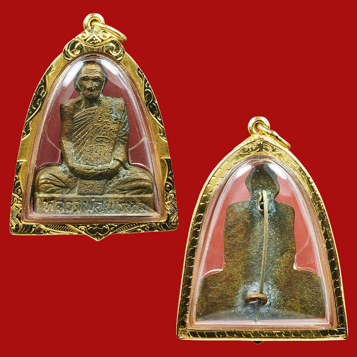 รูปเหมือนปั้มเข่ากว้างหลังเข็มกลัด หลวงพ่อพรหม วัดช่องแค ปี 16 ทองระฆัง
