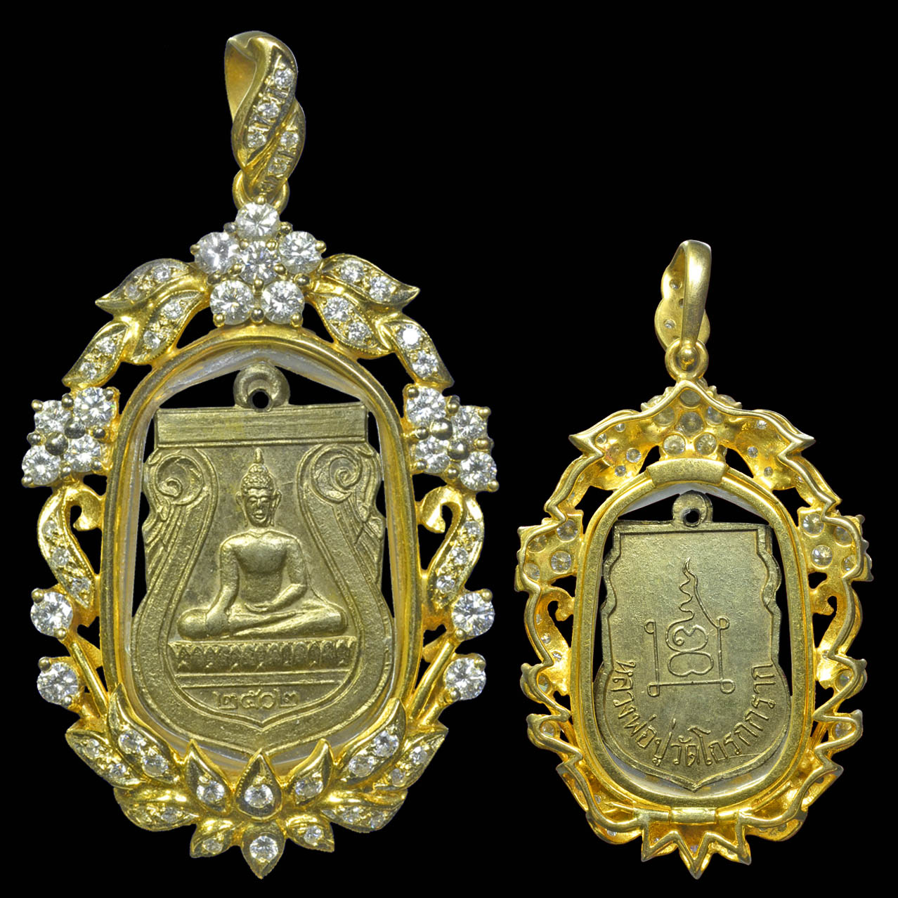 เหรียญหลวงพ่อปู่ วัดโกรกกราก รุ่นแรก เลี่ยมทองฝังเพชร ทองประมาณ 18 กรัม เพชรไซน์ 15 ตังค์ มี 18 เม็ด ไซน์ 5 ตังค์ มี 8 เม็ด ไซน์ 2 ตังค์ 34 เม็ด รวมประมาณ 3 กระรัต กับ 78 ตังค์