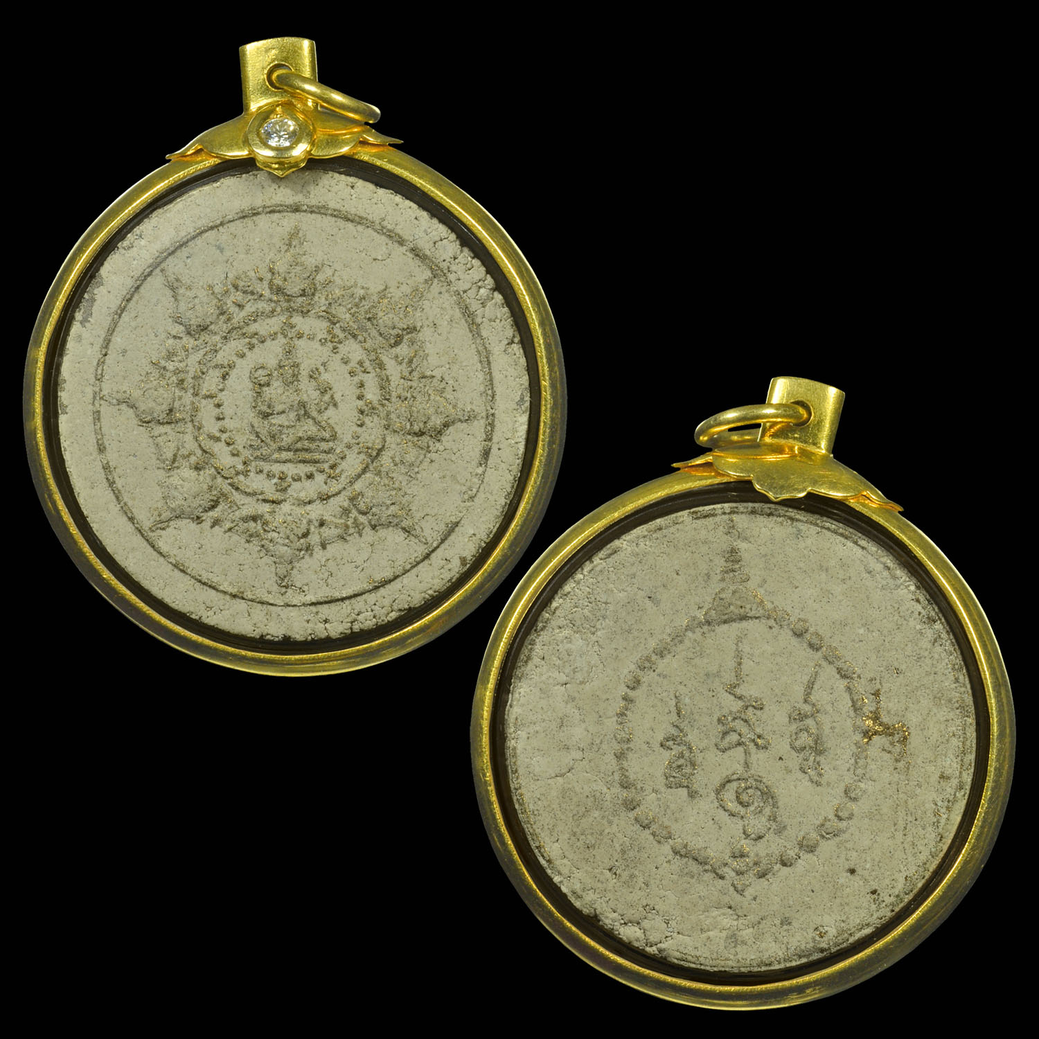 พระผงสุริยันจันทรา (จตุคาม) รุ่นแรก ปี 2530 พิมพ์เล็ก ขาวปัดทอง พร้อมเลี่ยมทองฝังเพชร ประมาณ 40 ตัง
