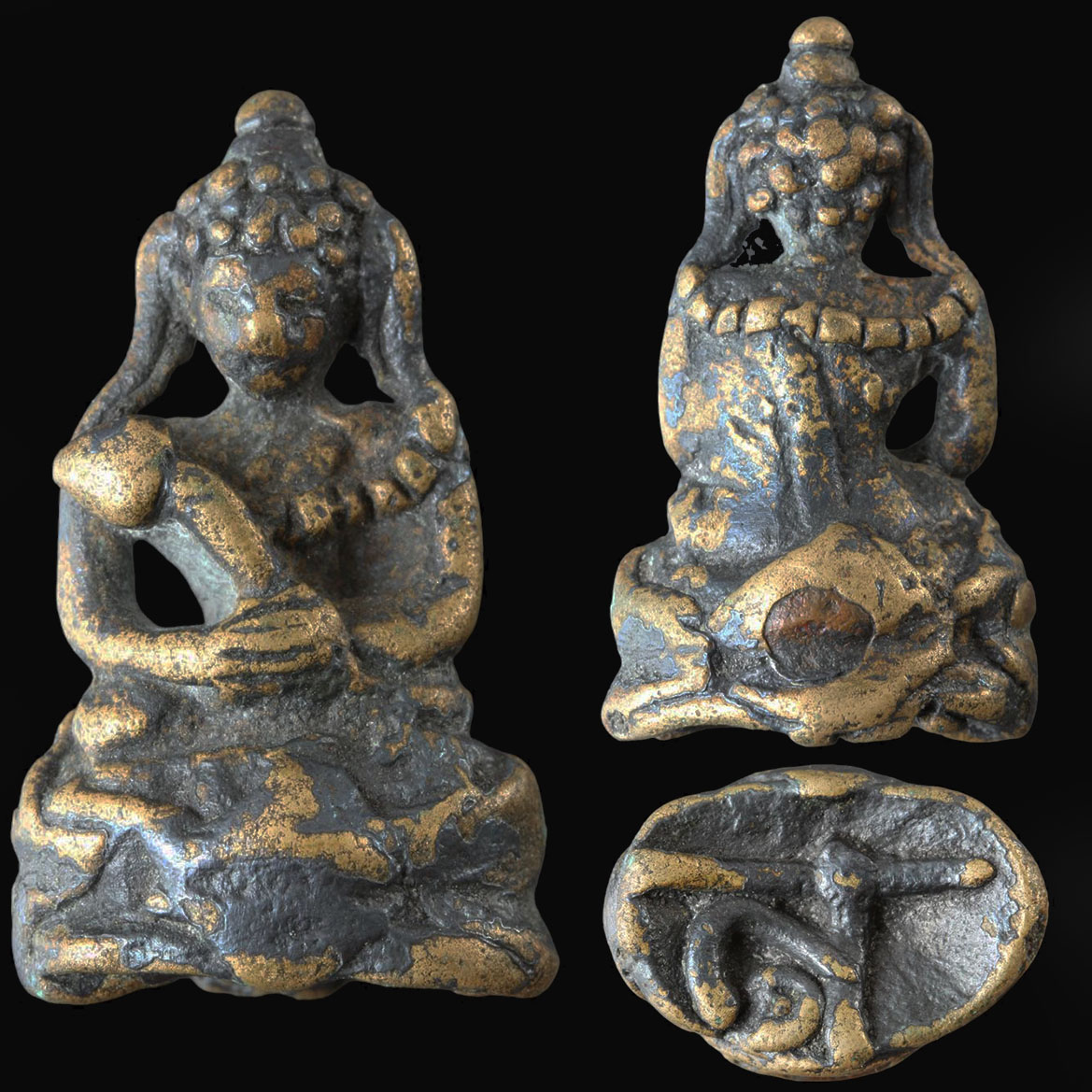 พระกริ่งตั๊กแตนถือดอกบัว ฐานบัวฟันปลา ยุคต้น สำริดลงหิน อาบเมฆพัด